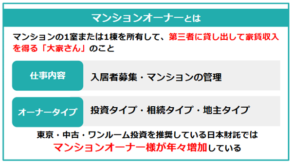 冒頭でも触れたように、マンションオーナーとは、マンションの1室または1棟を所有して、第三者に貸し出して家賃収入を得る「大家さん」のことです。