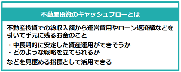 冒頭でも触れたとおり、不動産投資のキャッシュフローとは、総収入額から運営費用などを引いて手元に残るお金のことです。不動産投資をしたときに、手元に残るお金の流れが分かる指標として活用できます。【不動産投資のキャッシュフローで分かること】