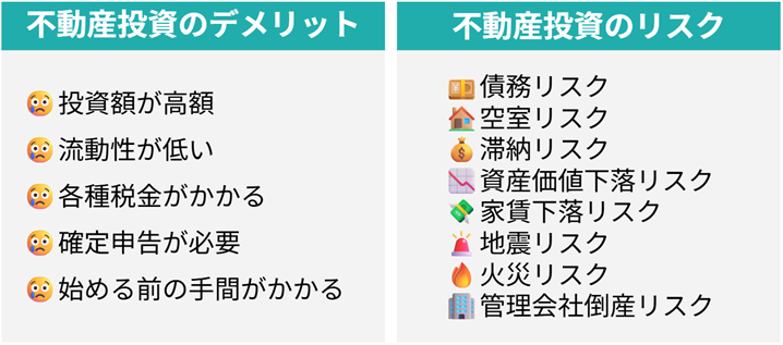 この記事では、不動産投資のデメリットやリスクについてまとめて解説していきました。◆不動産投資のデメリットと回避策