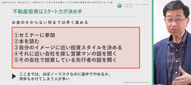 しかしながら、その考え方は非常に勿体ないものです。日本財託のセミナー講師も務める現役オーナーの台場氏は、不動産投資において最も重要なのは、一刻も早く行動に移す「スタート力」であると断言しています。