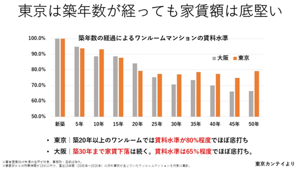 新築時に含まれる広告費などの「新築プレミアム」を避け、価格が安く利回りが高い中古を選ぶことで、購入後の大幅な価格下落や家賃下落のリスクを抑えられます。東京23区の中古ワンルームは、築20年を過ぎると賃料が底打ちして安定する傾向があります。