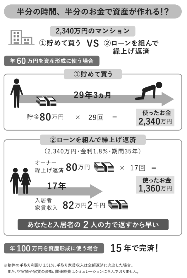 たとえば2,340万円のマンションを手に入れるために、「(1)貯めてから買う」場合と、「(2)ローンを組んで繰り上げ返済する」場合で、どれほど効率に差が出るかを比較しています。