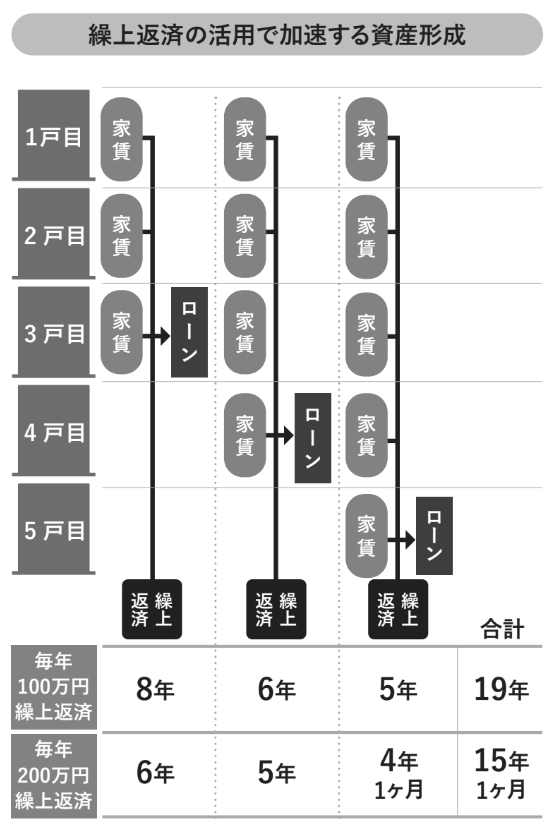 具体的には、自分自身の繰り上げ返済資金に加えて、すでに完済した物件から生み出される「家賃収入」をすべて次のローンの返済へと集中投下します。返済に回せる資金額が雪だるま式に増えていくため、以下画像にある通り、1戸目の完済に8年かかったとしても、3戸目はわずか5年で完済できるといった「複利のような加速」が起こるのです。