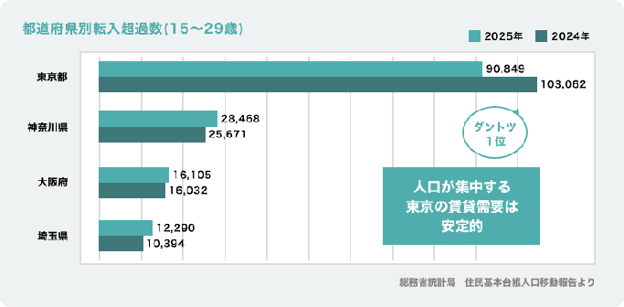東京都には、賃貸物件の入居者層となる15〜29歳までの若者が集まり続けており、他地域に比べて賃貸需要が高い点が特徴です。